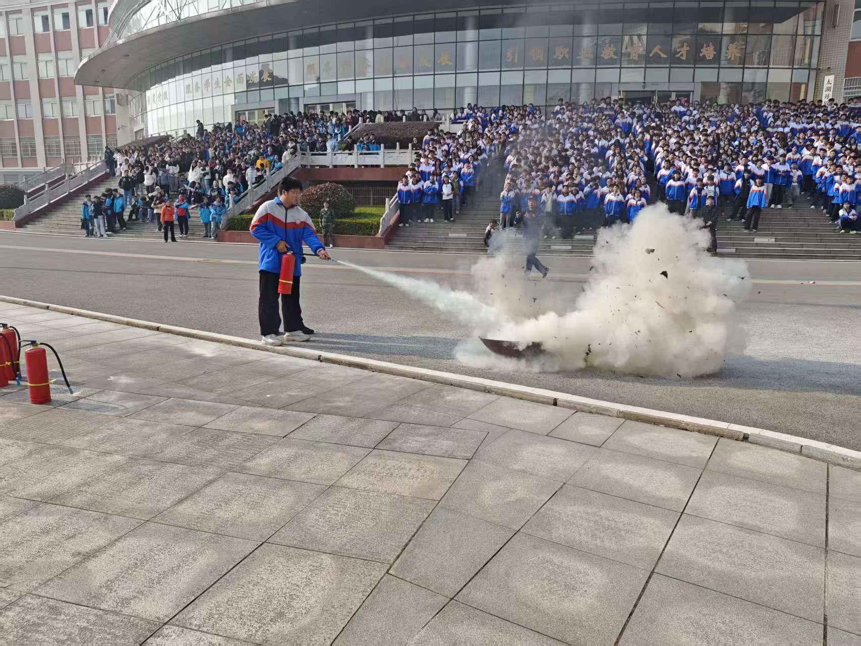 集结完毕后,消防大队在有为广场上现场为全体师生开展消防安全操作培训。县消防大队官兵现场细致讲解灭火器的构造原理、操作步骤、适用场景及安全要点,通过标准演示让大家直观掌握“提、拔、握、压”四步使用法的核心要领。在消防队官兵指导下,高一年级学生代表上前演示操作,同学们面对模拟火源沉着冷静,严格按照操作规范成功完成灭火动作,全体同学认真观摩学习,现场掌握了灭火器的使用方法,学习了扑救初起火灾的实战技能,提高了消防安全意识与自我保护能力。