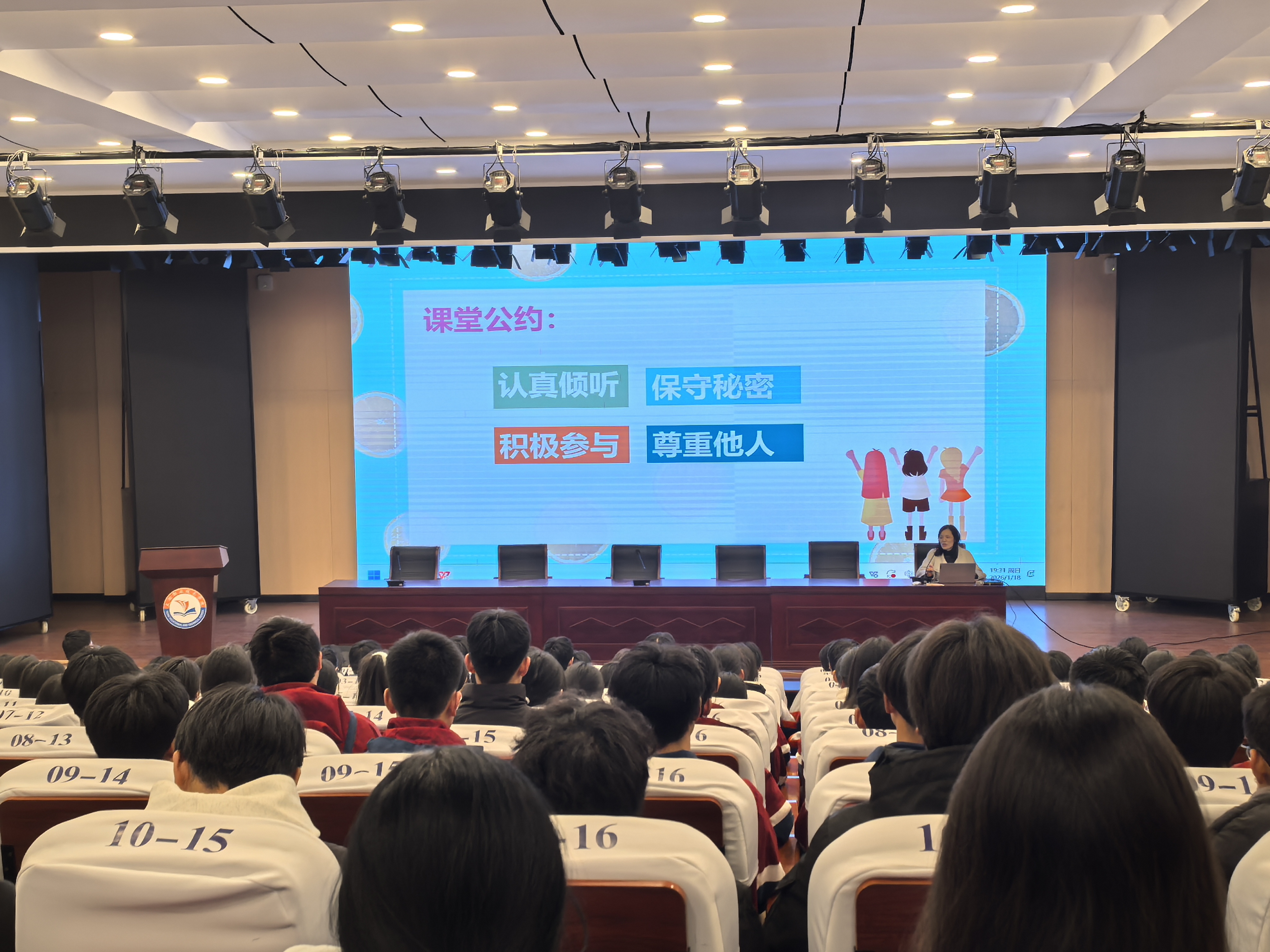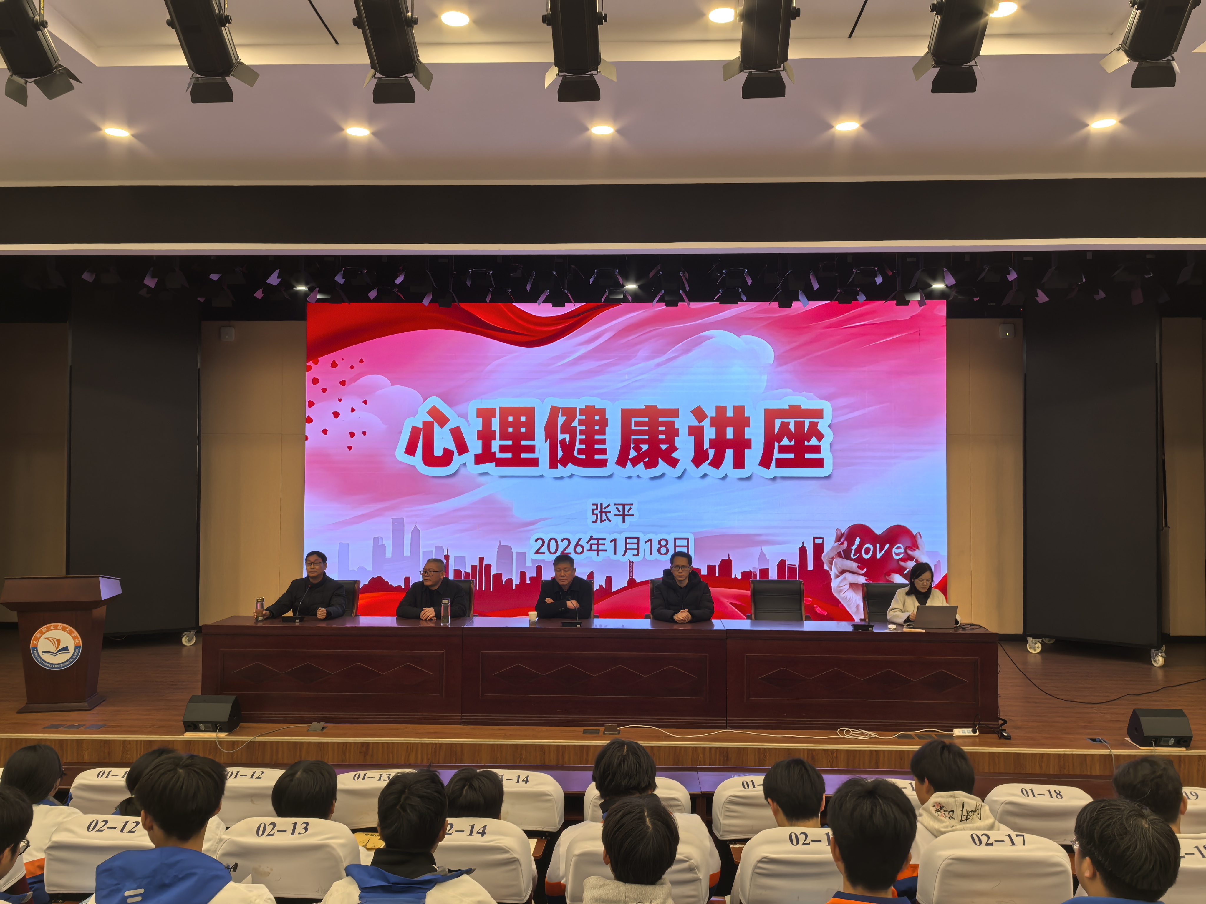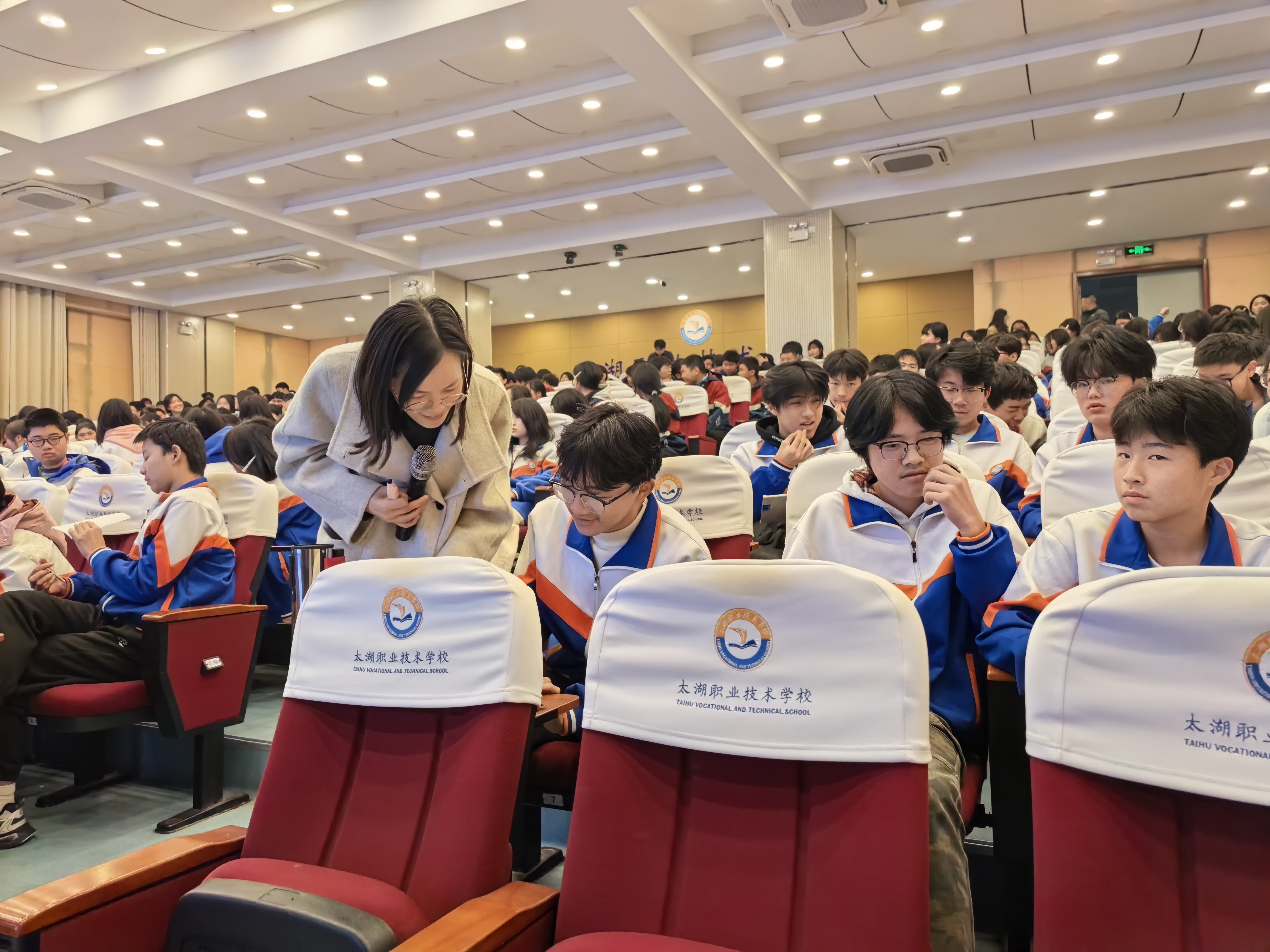 2026年1月18日,太湖职业技术学校在致公楼报告厅举行职业生涯规划专题讲座。讲座邀请了国家二级心理咨询师、新仓镇中心学校张平老师主讲,县教育局关工委常务副主任、县心理学会会长余世平,县心理学会秘书长吴和瑞应邀出席活动,学校党总支委员殷仕安,政教处主任方明华、政教处、高一年级部相关同志参加,本部校区高一年级300余同学、技工校区高一年级80余同学共同聆听了专题报告。