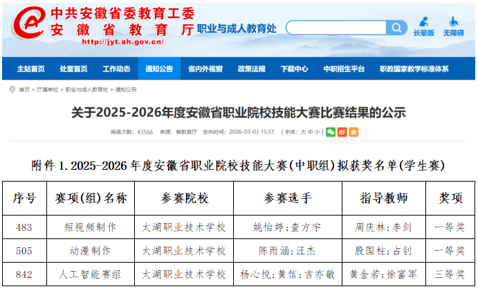 春潮涌动传捷报,技能逐梦绽芳华!近日,安徽省教育厅网站公布了《关于2025-2026年度安徽省职业院校技能大赛比赛结果的公示》,太湖职业技术学校在全省中职院校众多参赛队伍中脱颖而出、斩获佳绩,用实力彰显我校技能育人的扎实成效,为学校赢得了荣誉,为我市我县增添了光彩!