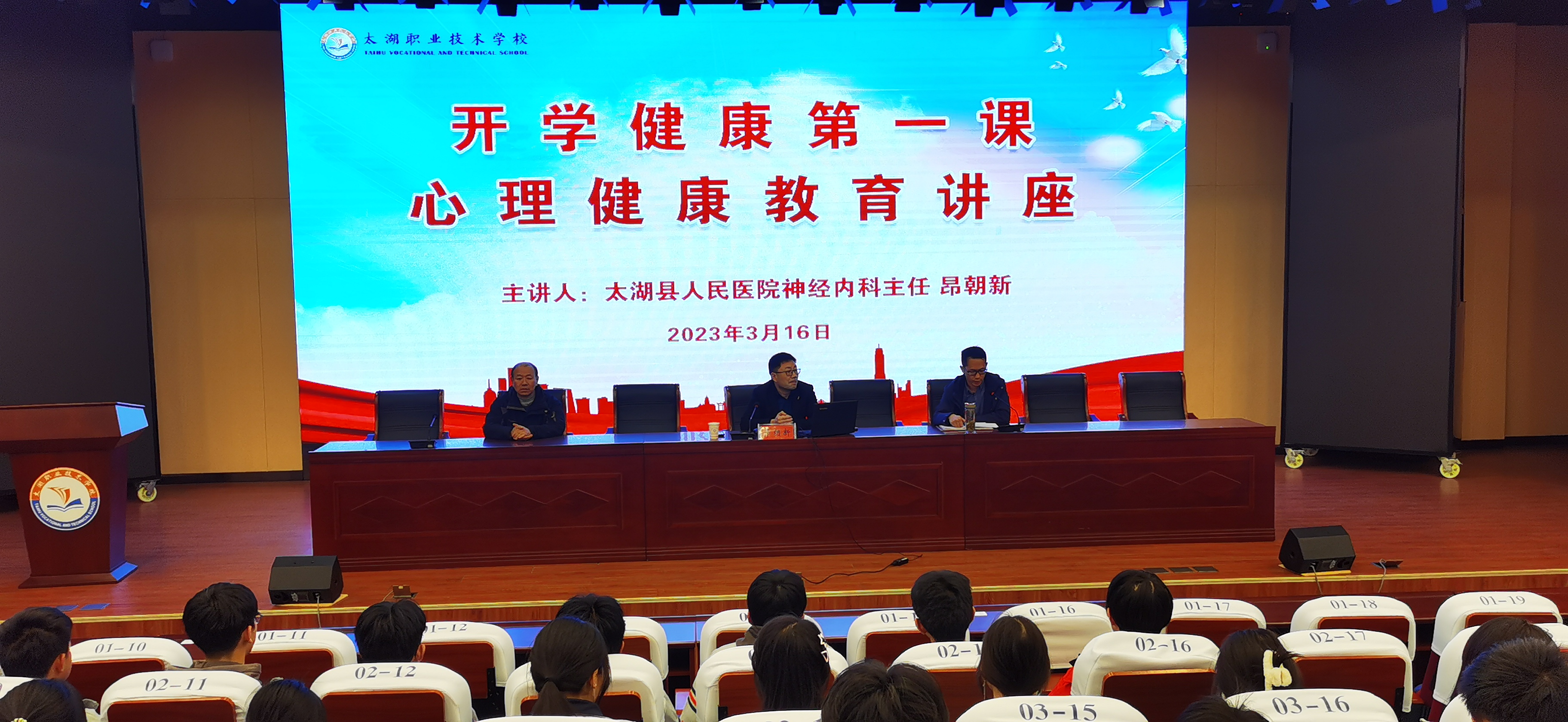 3月16日,太湖职业技术学校在科研楼报告厅举办以“打造阳光心理、塑造健全人格”学生心理健康知识讲座。讲座邀请了县人民医院神经内科主任昂朝新为同学们作报告,校长助理殷仕安主持讲座,政教处主任高章艳、部分班主任,以及高一、高二年级部分学生代表共300余人参加了讲座。