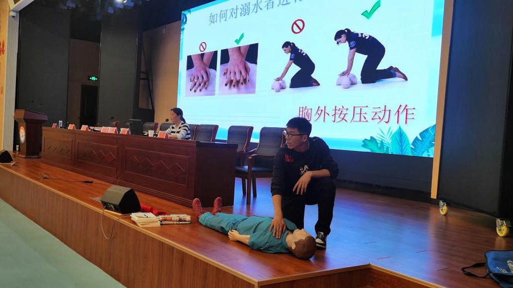 宣传团宣讲员阳志锐老师作防溺水知识专题讲座,强调了“六不准”“四牢记”,教育同学们要远离危险水域,坚决落实防溺水的要求。杨泽老师现场讲授心肺复苏救护知识和操作要领,他借助模拟人进行了详细的现场操作演示,对各个操作要领和流程逐一进行讲解和示范。现场气氛十分活跃,学生们积极参与了现场提问、有奖竞答的活动,和宣讲老师们一起进行心肺复苏术的现场操作,通过动手操作掌握了知识要领。