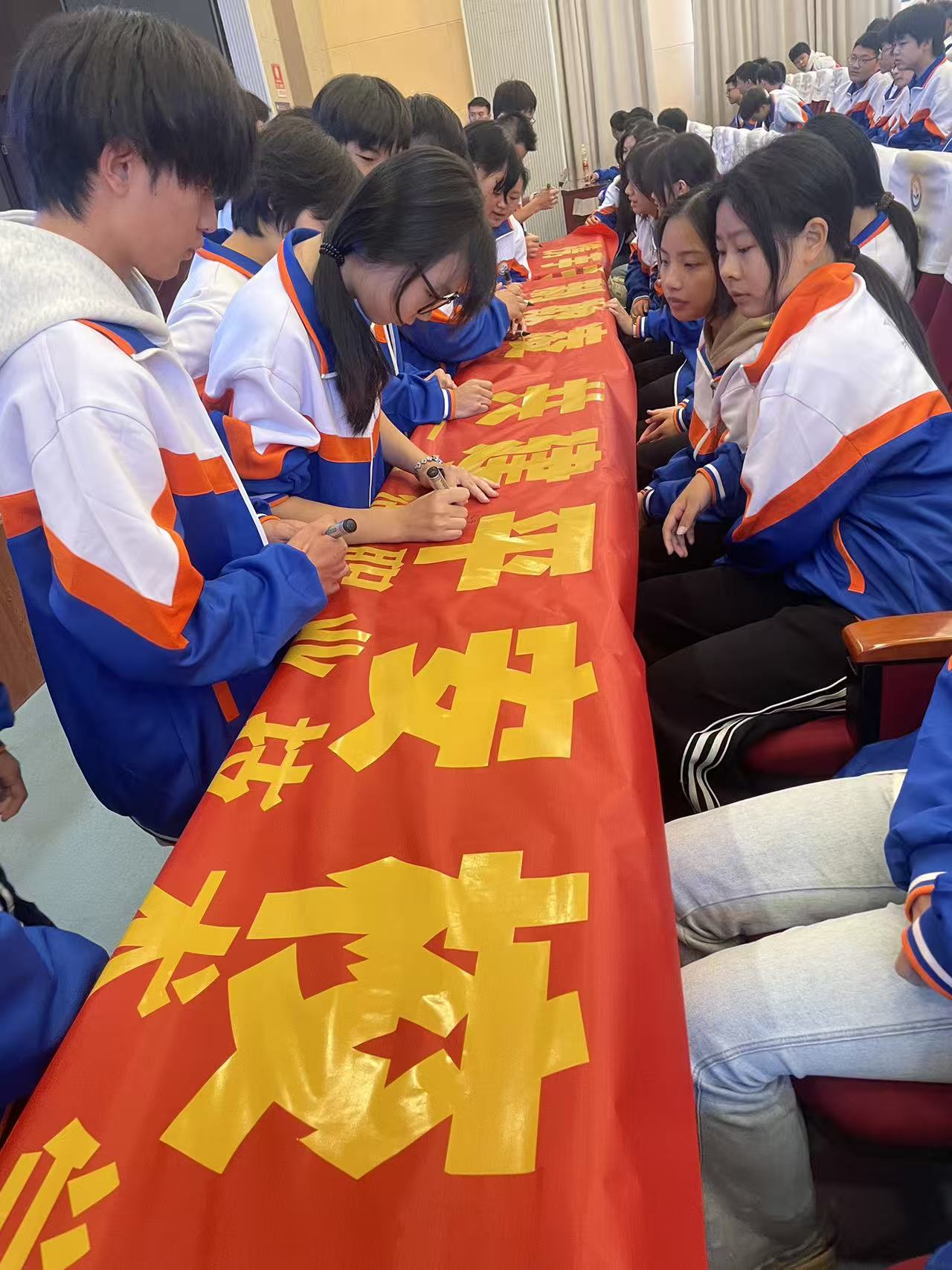 “拒绝校园欺凌,共建平安校园”主题横幅前,学生代表依次签名,以笔为誓;随后全体学生起立,政教处主任方明华同志带领同学们宣誓,领誓下举起右拳——“不做施暴者、不做旁观者、及时报告欺凌事件”的誓词,将反欺凌的决心转化为可践行的行动承诺。