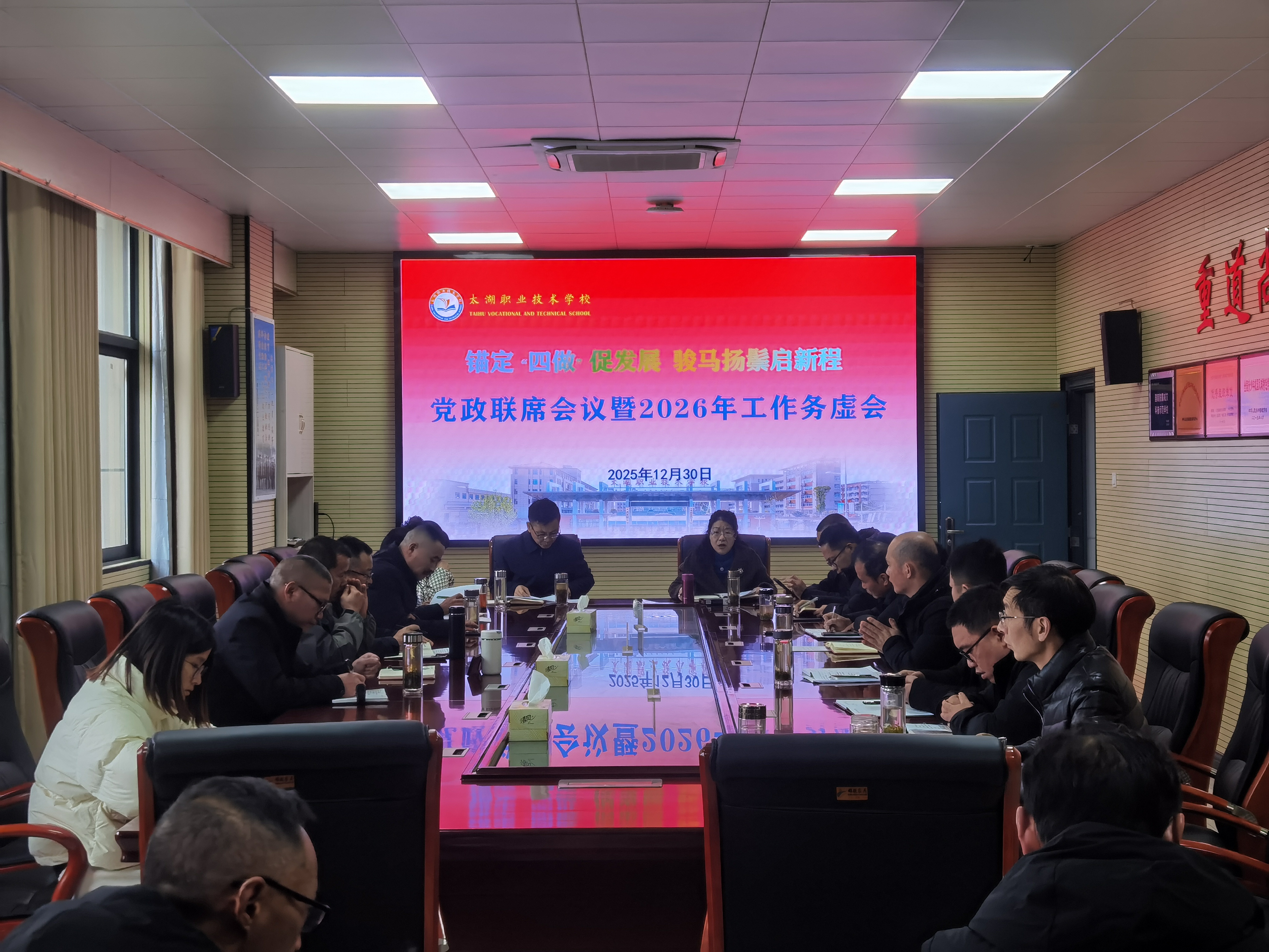 12月30日,学校在致公楼310会议室召开党政联席会议暨2026年度工作务虚会。会议全面总结了2025年工作,详细谋划了2026年发展思路,着力推进职教事业朝着更高质量、更高水平迈进。学校党政班子主要负责同志出席会议,全体班子成员,全体行政干部、年级部长以及教研组长参加会议。会议由校长主持。