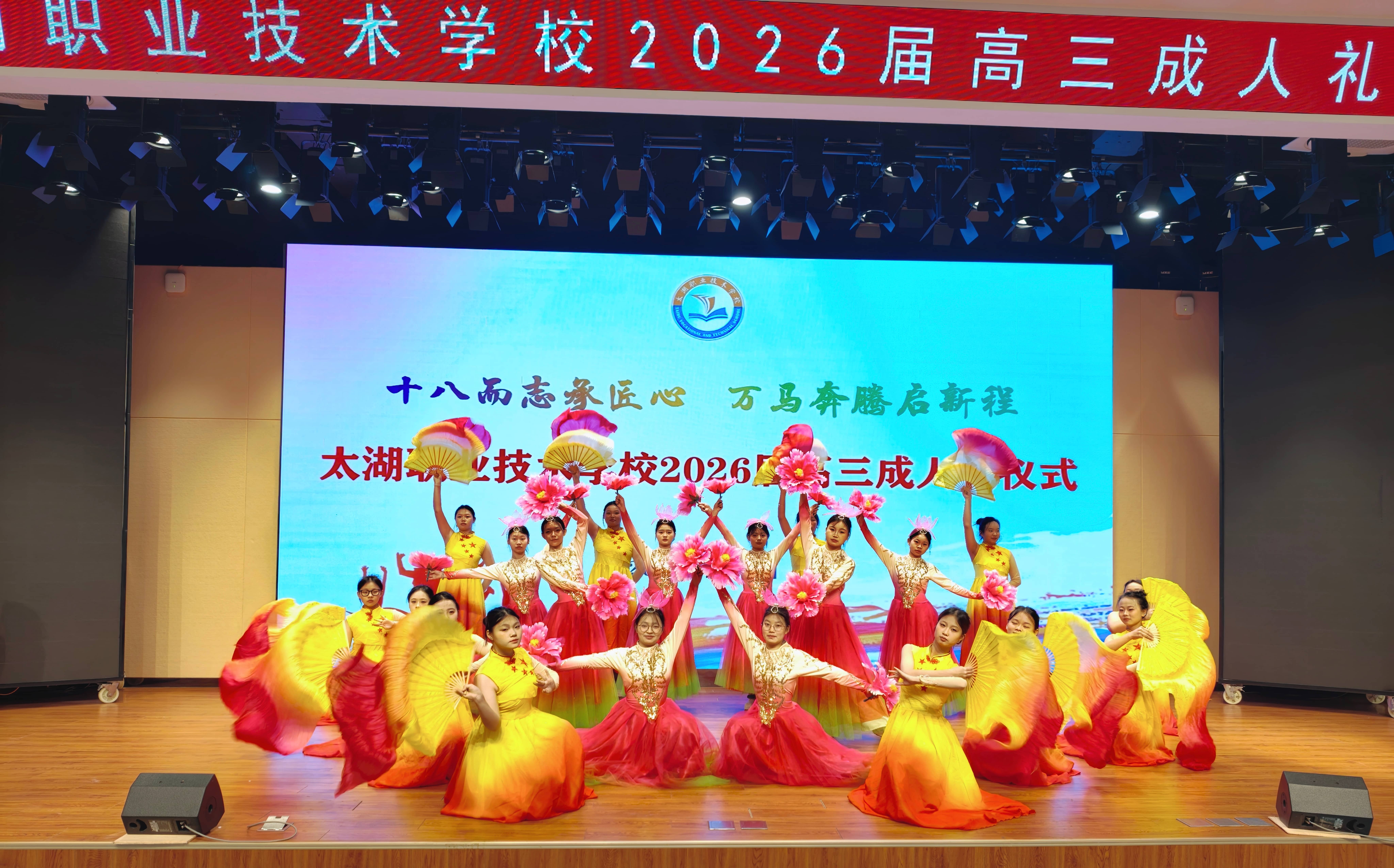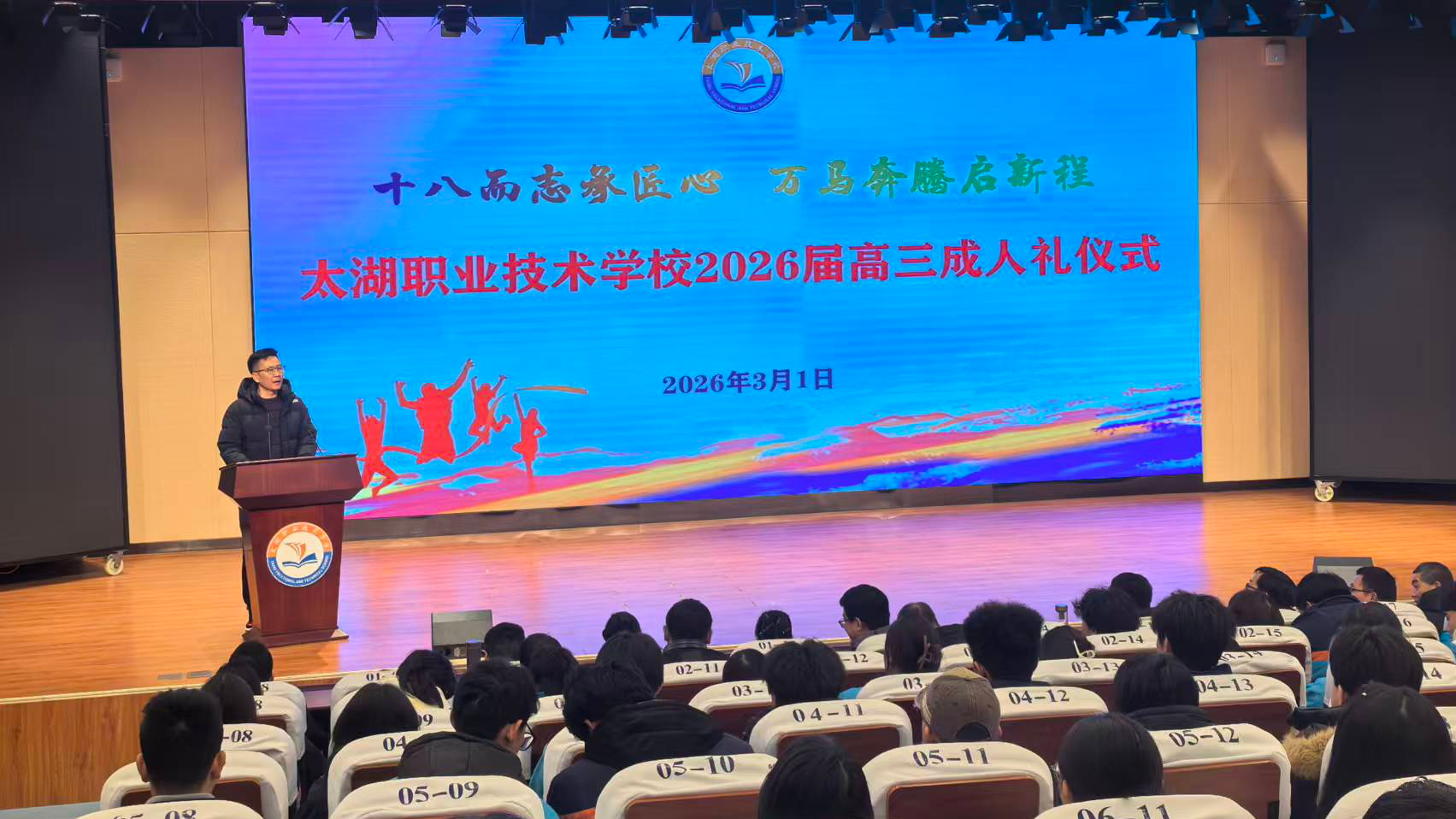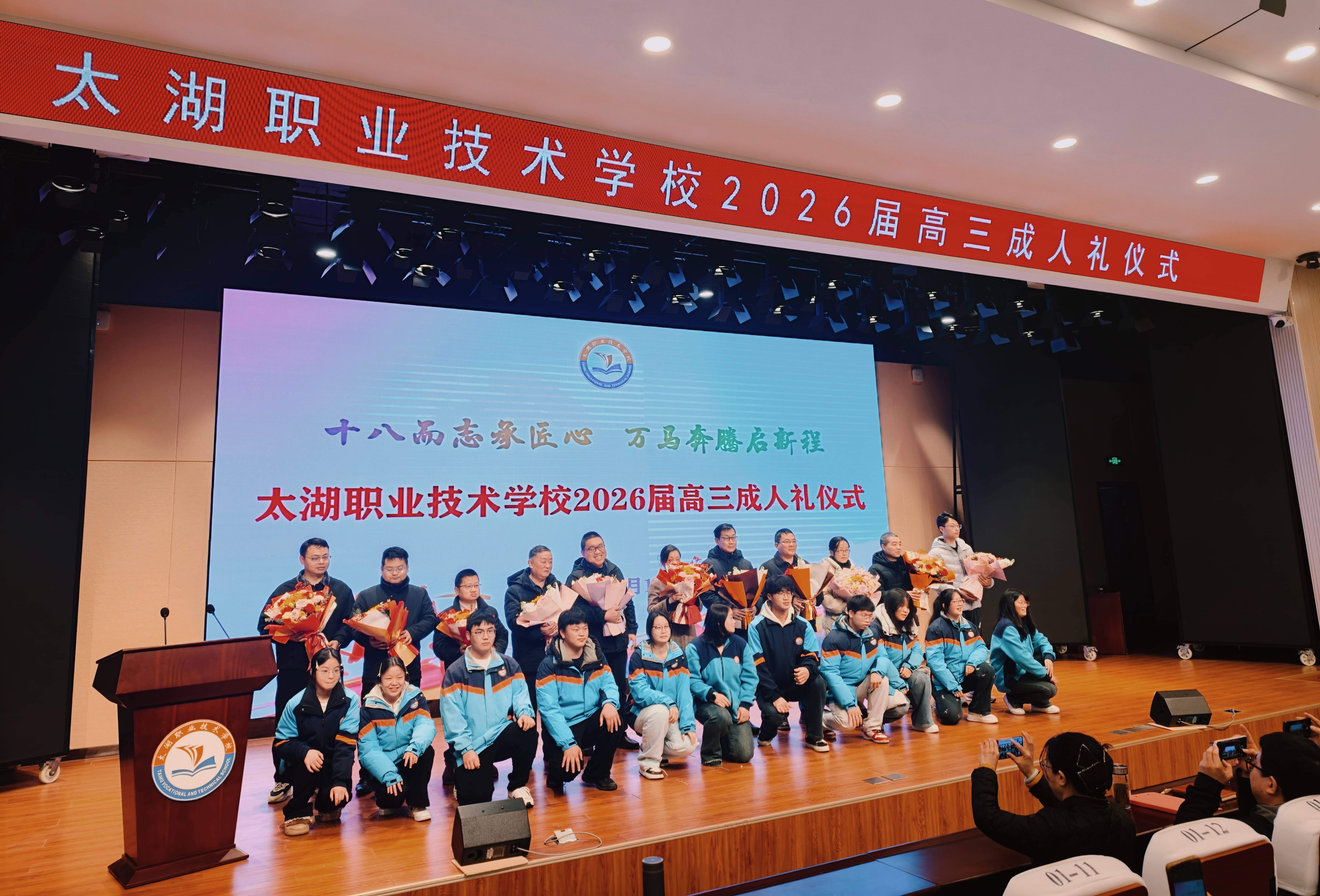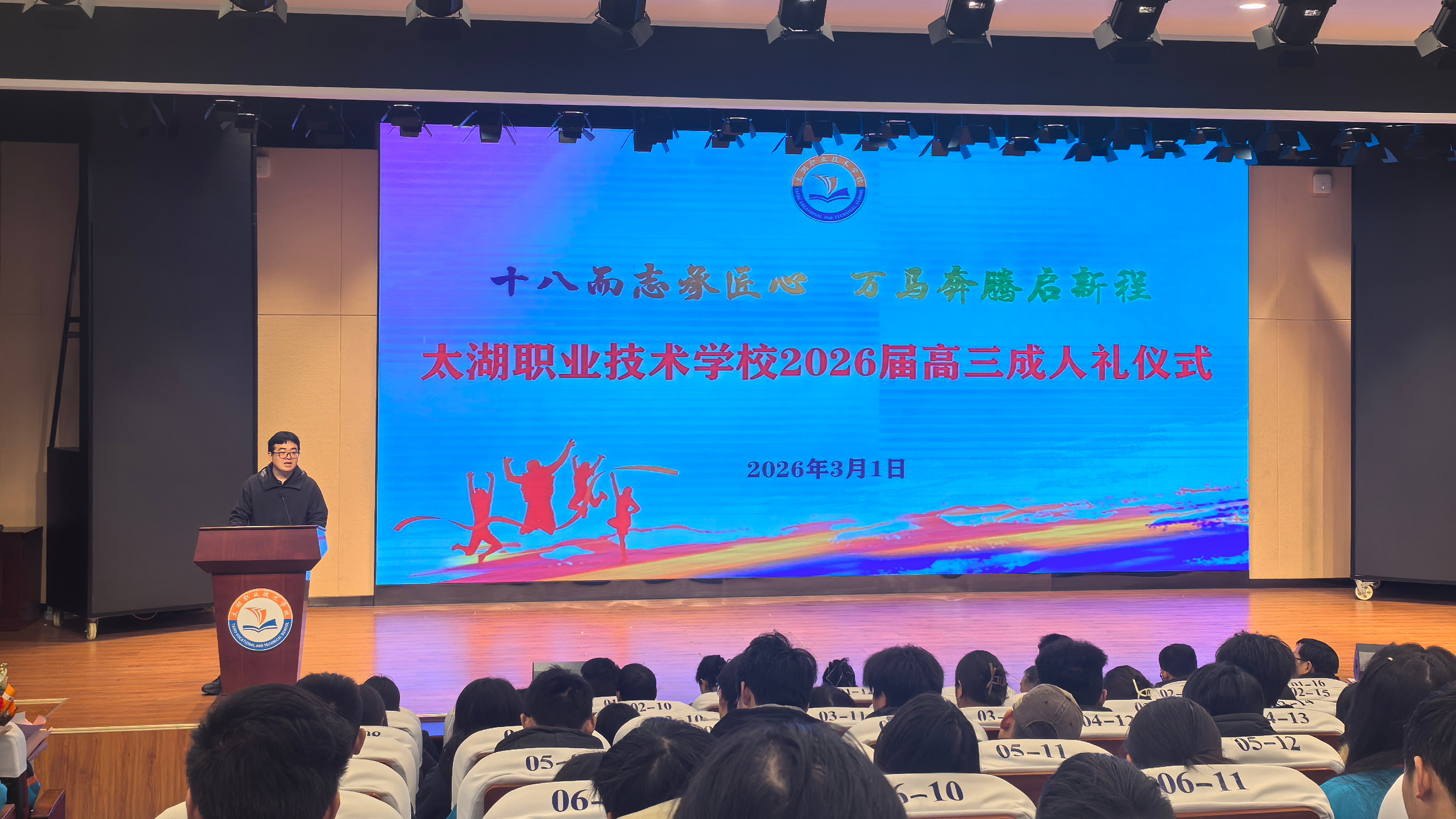 3月1日,太湖职业技术学校在致公楼一楼多功能厅隆重举行2026届高三毕业生成人礼仪式。团县委副书记汪子杨应邀出席活动并致辞,学校党总支书记程永红、校长周玲出席,学校党总支委员殷仕安、周君,全体高三年级班主任、校团委全体成员、部分家长代表以及高三学子300余人参加活动,共同见证高三学子们迈入十八岁的圣神而庄严时刻。