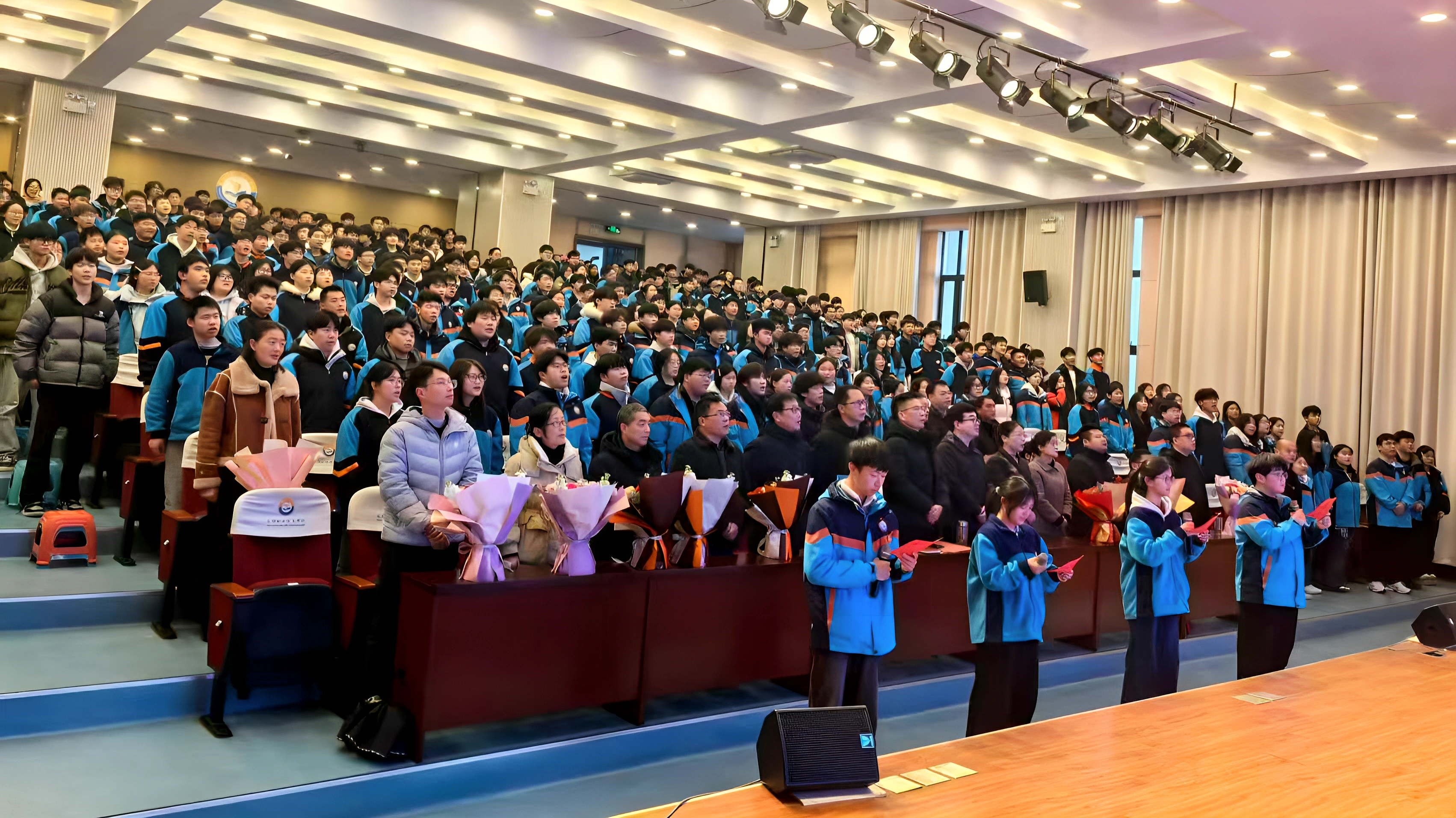 活动现场灯光明亮,师生们济济一堂。仪式在一支活力四射、激情澎湃的暖场舞蹈《春潮花海》中拉开帷幕,学校舞蹈队的同学们踏着欢快的节奏,舞起来跳起来,尽情表达对十八岁成长的热情和期待,尽显高三学子们朝气蓬勃和青春活力。活动现场温情满溢,学生代表手捧鲜花向敬爱的老师们一一献花,深情鞠躬,感念老师们三年的教诲之恩和培养之情。活动现场誓言铮铮,全体高三学子高举右拳,面向国旗庄严宣誓,铿锵有力的声音响彻全场,宣示了每一个自己正式步入十八岁,立下拼搏奋斗的青春诺言。
