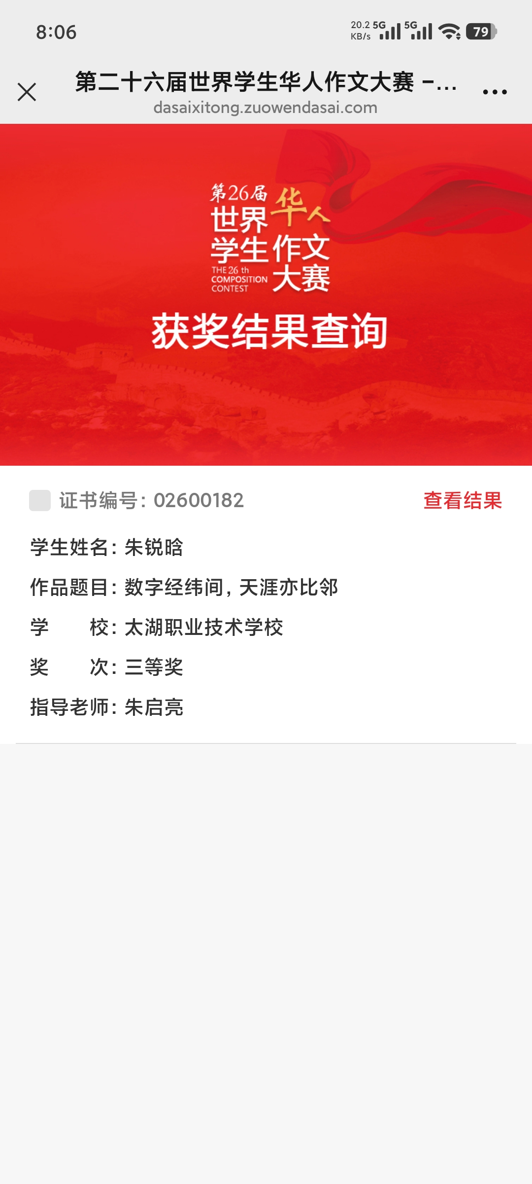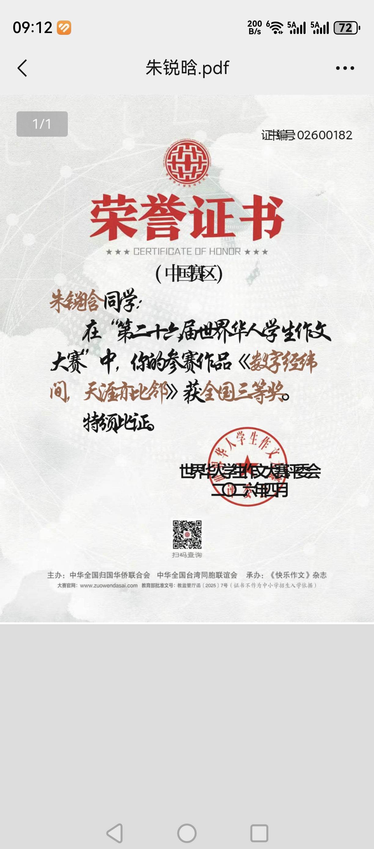 近日,第二十六届世界华人学生作文大赛中获奖名单正式揭晓,太湖职业技术学校24级电子班朱锐晗同学撰写的《数字经纬间 天涯亦比邻》作文荣获大赛三等奖!此次获奖来之不易,是学校首次在高规格的国际性作文赛事中成功晋级并获得荣誉,实现了学校在该项赛事奖项上零的突破。